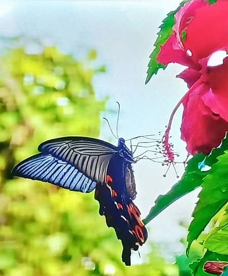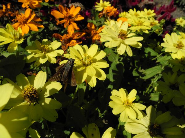 近くの公園の花壇 ジニア(ヒャクニチソウ)にイチモンジセセリ?が