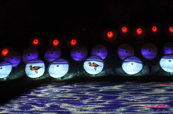 今日も「ぎふ灯り物語」のイベントから和傘が沢山並べられて光が変化するプロジェクションマッピングが見れました。
